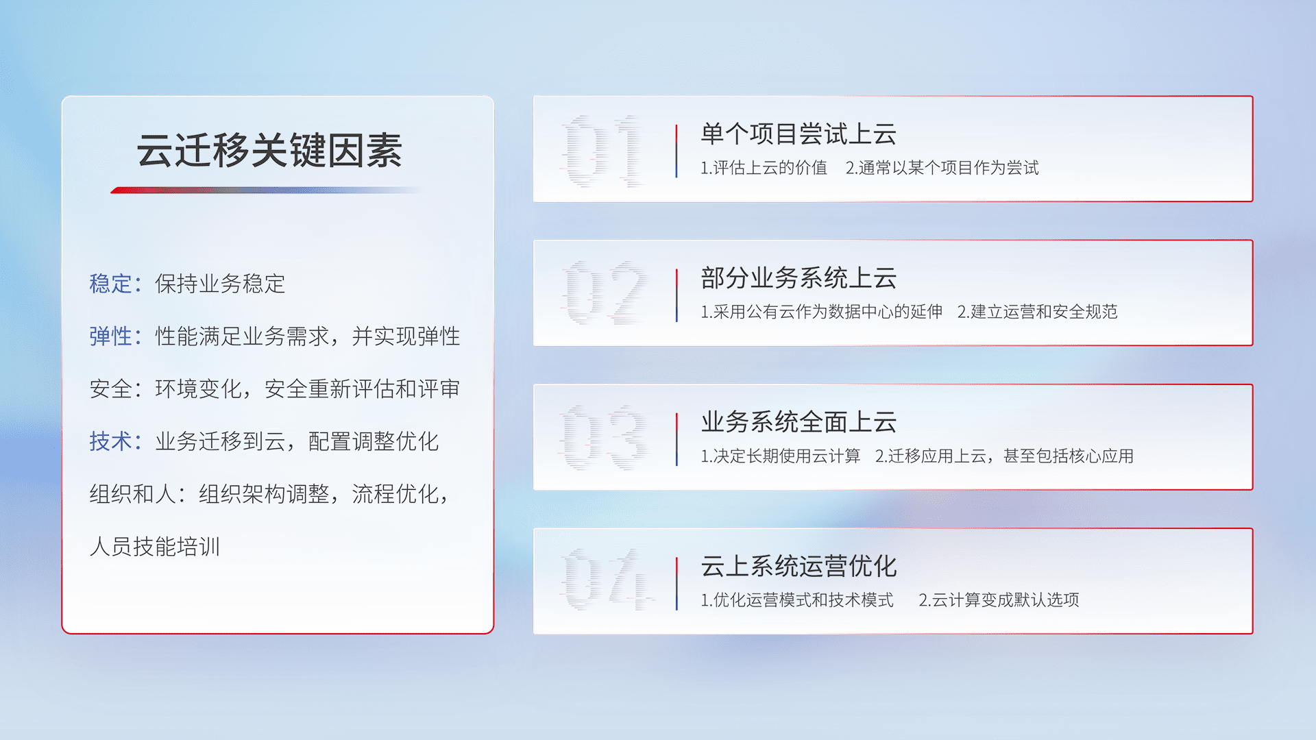结合实际业务,,,从规划设计、、云平台选型、、云原生改造、、、、数据迁移、、集成交付,,,,迁移全过程为客户识别最佳上云路径,,做好风险识别管理,,设计网络架构、、身份权限、、、、安全审计合规、、、、操作审计、、、、日志审计、、、监控告警策略、、、多站点容灾设计等,,对云上基础设施进行整体规划,,,,提升IT治理水平,,,,以满足弹性、、、、高可用、、、、高性能的需求。。。
