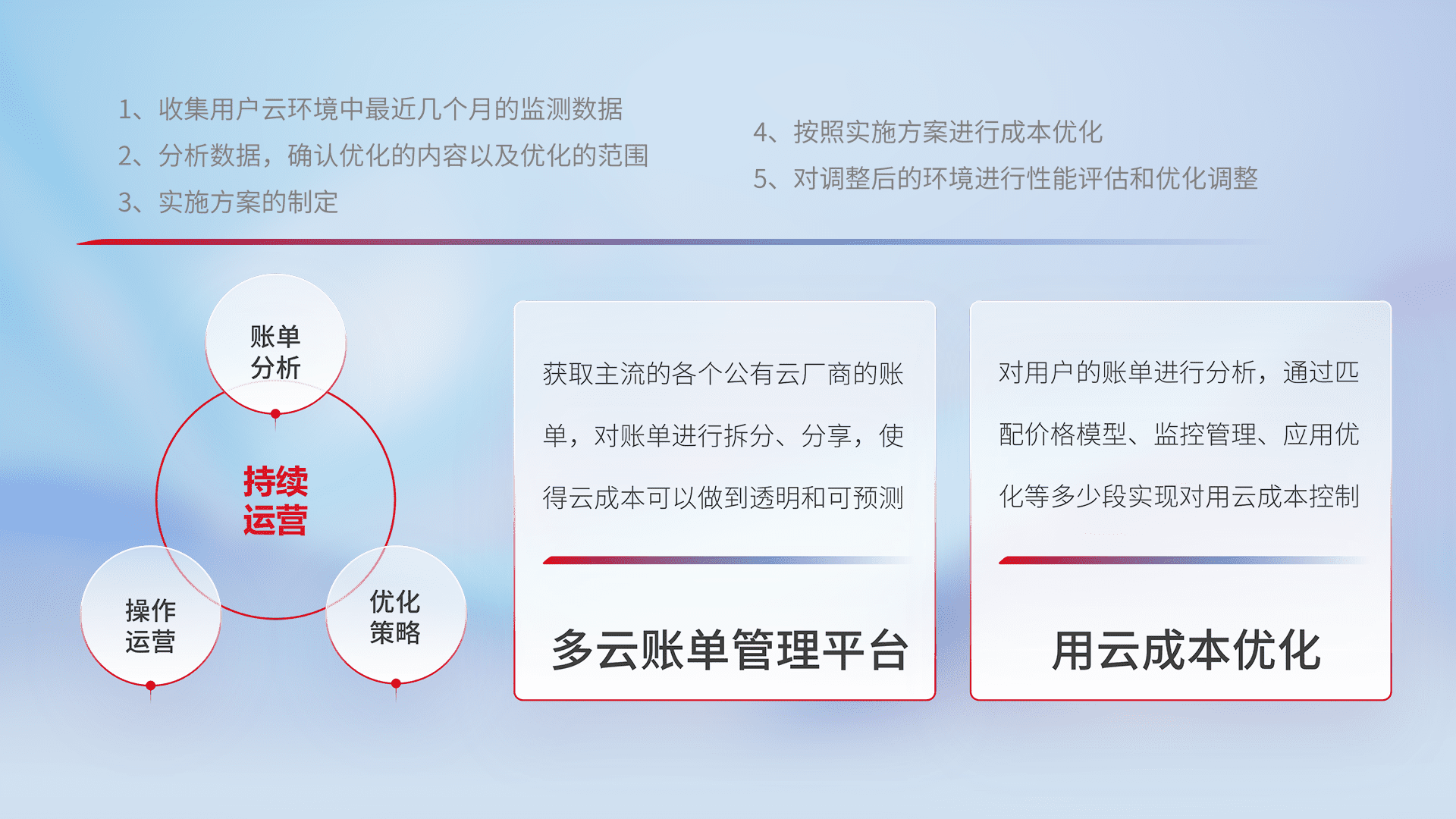 通过灵活运用多种自动化迁移工具,,,帮助企业用户实现业务和数据高效 、、、稳定的上云迁移和云上迁移,,采用自研多云纳管平台,,以中立管理模式,,,,解决多组织、、、、多云、、多运维厂商的复杂关系的管理,,保证多云平台资源配置的一致性,,,,实时掌控云资源运行数据,,,,运用智能化工具分析云资源多云平台的管理服务,,,透明化管理成本支出,,,用云成本可预测、、用云费用可优化、、、云资源配额有据可依。。