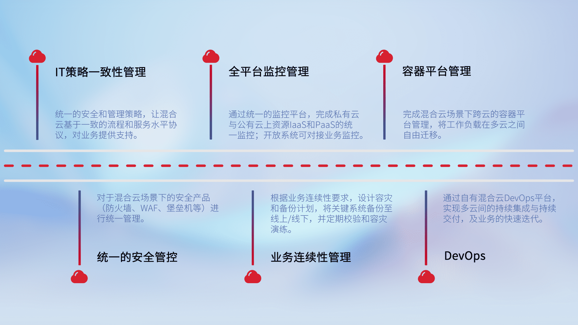 通过多云纳管,,,,以统一的资源数据模型把客户的云资源进行抽象和封装,,进而实现对多云资源的统一操作,,保障云资源管理的可靠性、、稳定性与可用性。。。量身定制化运维内容,,,,配置、、、开发运维、、、补丁管理、、备份、、监控、、、认证和访问管理、、、审计和日常巡检等,,保障在用云过程中的可靠度,,,稳定度以及高可用率。。。