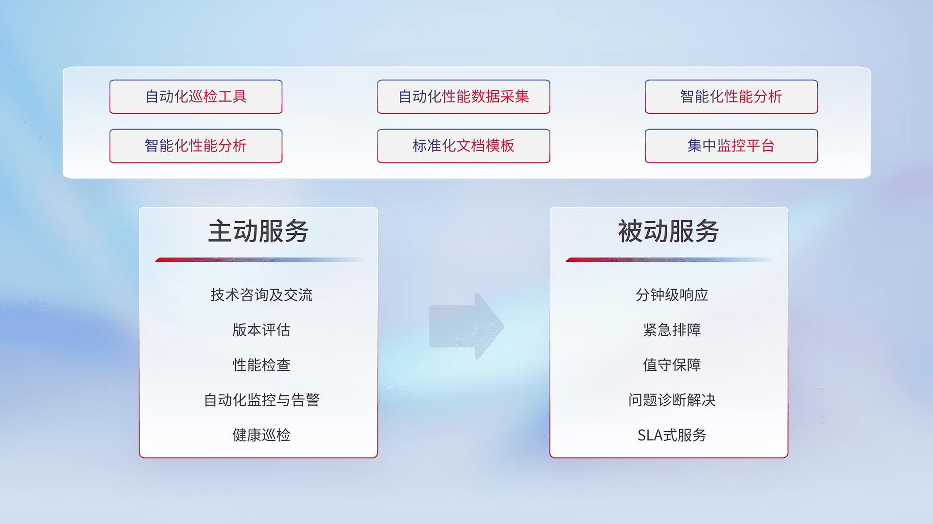 智能化工具和标准化文档,,保障服务质量,,,,提供主动服务(包含技术咨询、、、版本评估、、性能检查、、、、自动化监控与告警、、、、健康巡检)和被动服务包含(分钟级响应、、、紧急排障、、、、值守保障、、问题诊断解决、、、SLA服务)。。